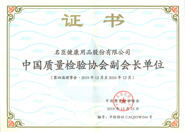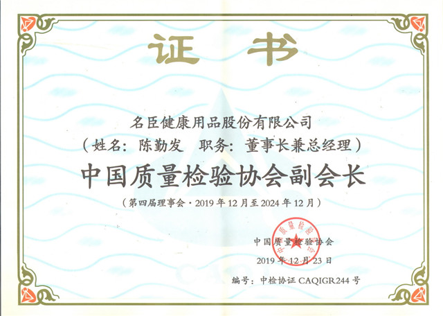名臣健康用品股份有限公司董事长陈勤发在本次会议上当选中国质量检验协会第四届理事会副会长。